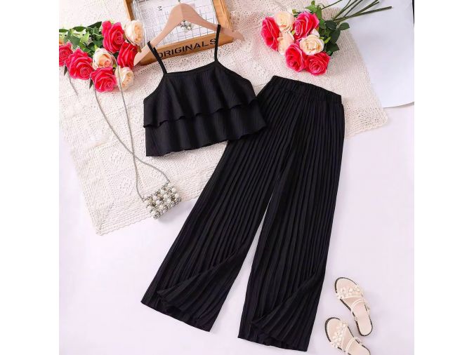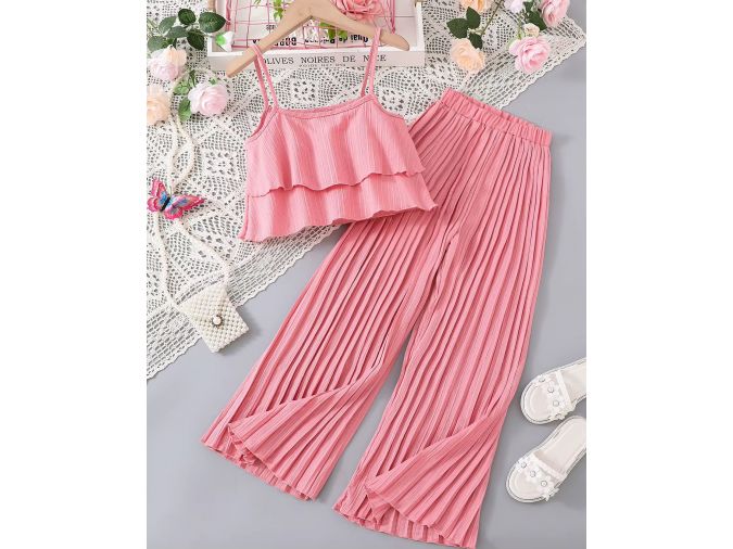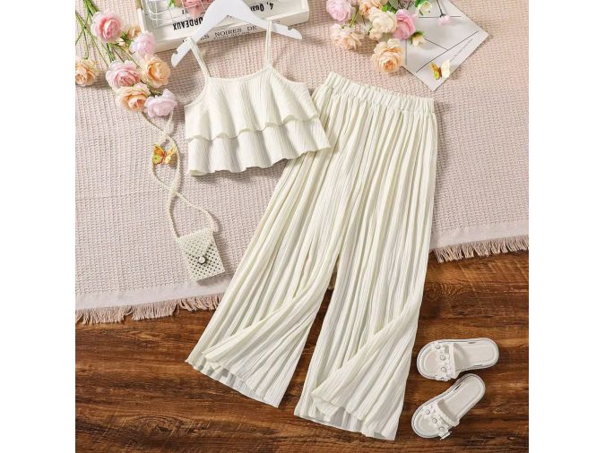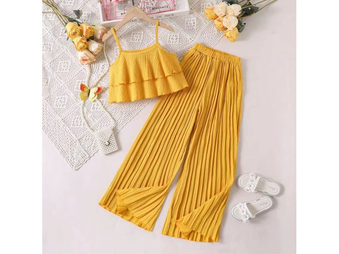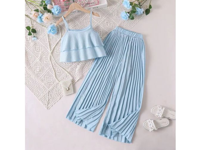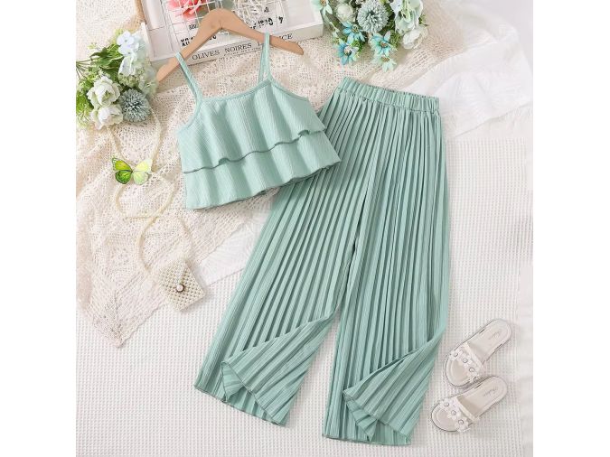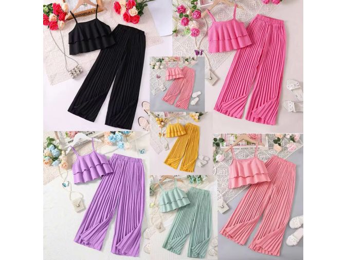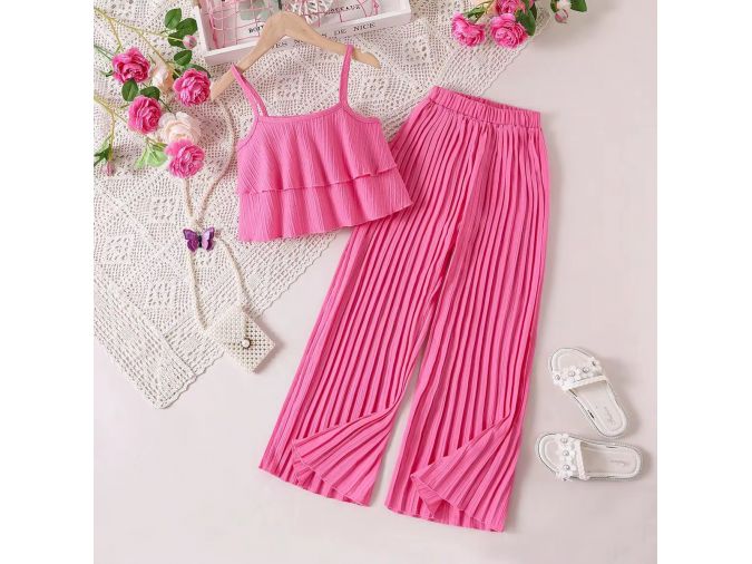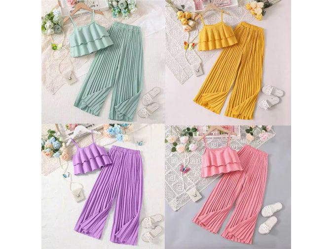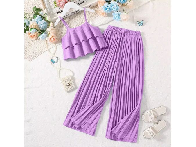 Keep it light and breezy with this adorable girls pleated two-piece summer set, available at unbeatable wholesale prices! Featuring a flowy sleeveless ruffle top and matching wide-leg pleated pants, this outfit is perfect for warm-weather outings, vacations, and casual events. Made from lightweight, breathable fabric for all-day comfort, this stylish set is a boutique favorite. Ideal for wholesale buyers looking to stock up on trendy, high-quality kidswear for the summer season.