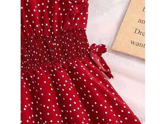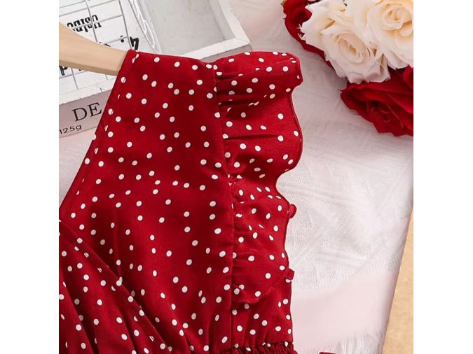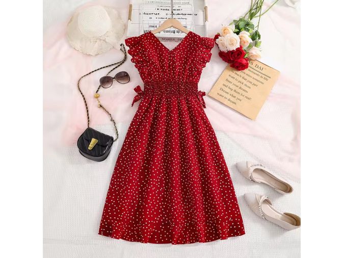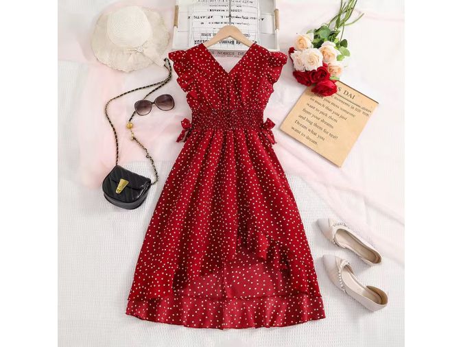 girls polka dot dress wholesale, red summer dress for kids, smocked waist girls dress, ruffle sleeve children’s dress, boutique kidswear wholesale, midi dress for girls, sleeveless polka dot dress, trendy girls clothing wholesale