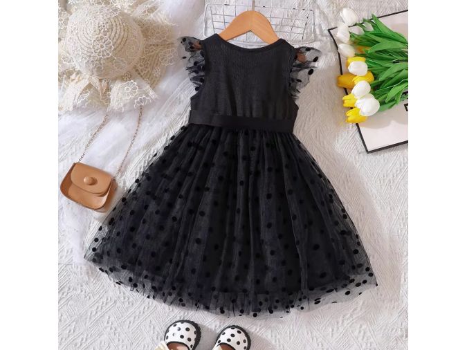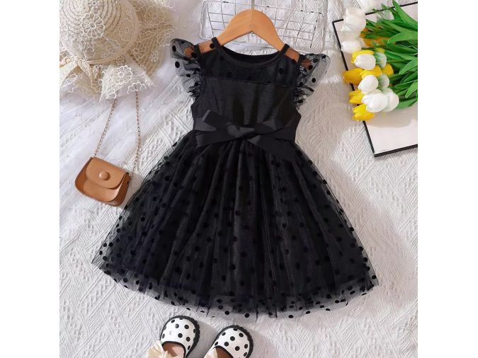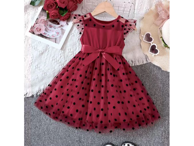 Bring elegance and charm to your store with this burgundy polka dot girls dress, now available at wholesale prices! This beautiful party dress features a layered tulle overlay with black polka dots, delicate flutter sleeves, and a satin waist bow for a picture-perfect look. Ideal for birthdays, weddings, or any special event, the soft inner lining ensures comfort while the flared skirt adds playful volume. Perfect for boutique owners and bulk buyers seeking high-quality, eye-catching girlswear.