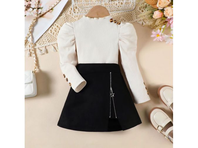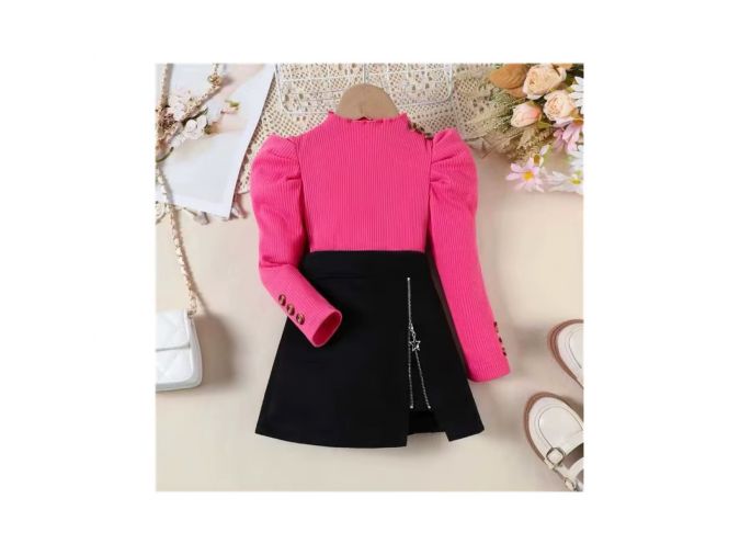 Elevate your store’s style collection with this trendy girls 2-piece outfit, available at wholesale prices! Featuring a ribbed puff sleeve top with bold button details and a high-waisted black mini skirt with a front star zipper accent, this set blends sophistication and flair. Available in vibrant pink or classic cream, it’s perfect for birthdays, outings, and mini fashionistas who love to stand out. Ideal for boutique owners and bulk buyers seeking modern, stylish kidswear.