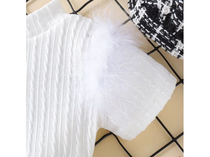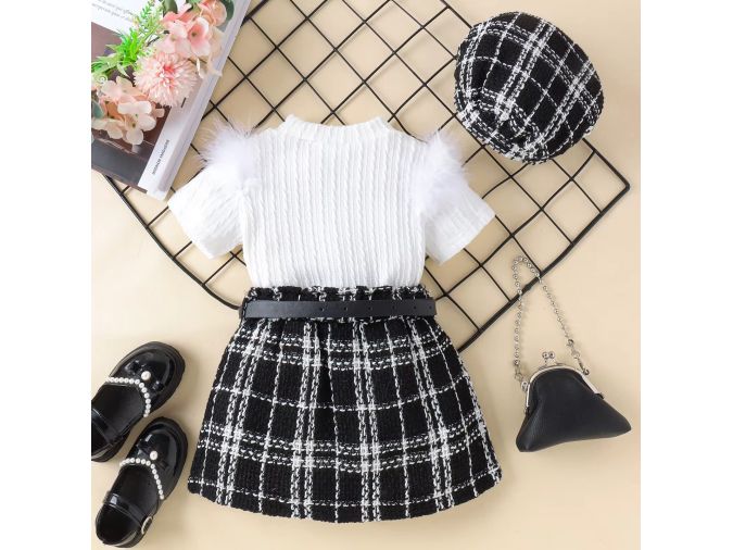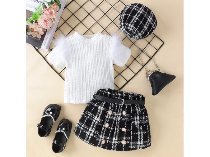 Add luxury to your kidswear collection with this elegant Parisian-inspired 2-piece girls outfit, available at wholesale prices! The set features a stylish white ribbed knit top with delicate feathered short sleeves, paired with a black-and-white plaid tweed skirt adorned with pearl buttons and a belt for added flair. Perfect for fashion-forward events, birthdays, or holiday outings. Ideal for boutique owners and bulk buyers looking for high-quality, on-trend children’s fashion.