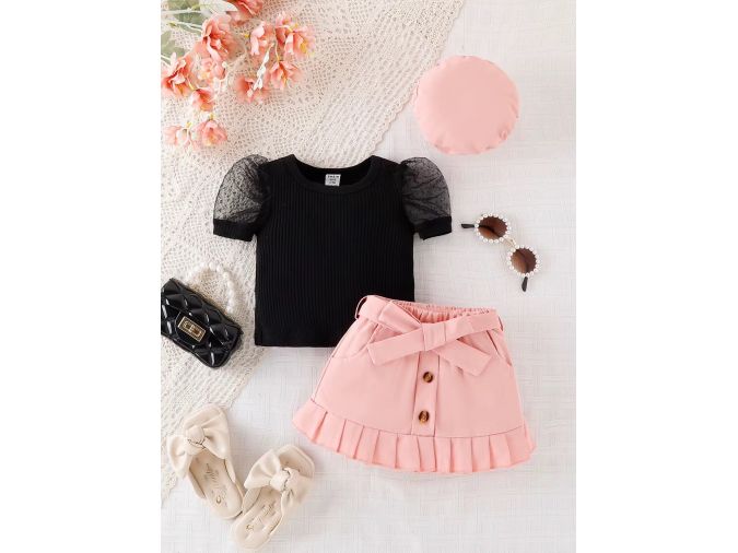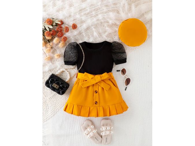 Brighten your boutique offerings with this bold and fashionable girls 3-piece set, available at unbeatable wholesale prices! This stylish outfit features a black ribbed top with sheer puff sleeves and cute bow cut-outs, paired with a vibrant mustard yellow skirt complete with front buttons, pleats, and a bow-tie waist. The matching mustard beret adds the perfect finishing touch. Ideal for birthdays, fashion-forward outings, and seasonal photoshoots. Perfect for retailers looking for eye-catching girlswear.