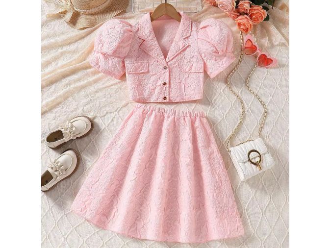 girls blazer skirt set wholesale, puff sleeve girls outfit, textured 2-piece set kids, pink and white girls fashion, boutique toddler outfit wholesale, elegant girls formal set, stylish kidswear wholesale, girls matching outfit with skirt