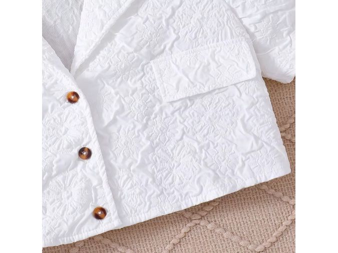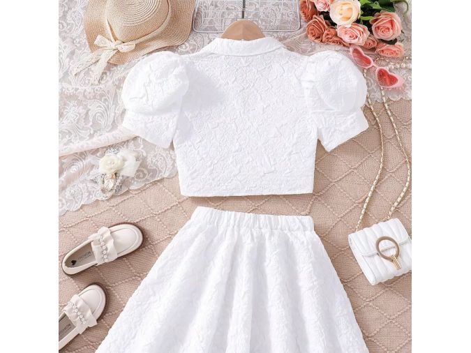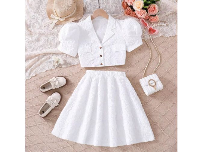 Elevate your boutique collection with this sophisticated girls 2-piece set featuring a textured puff sleeve cropped blazer top and a matching A-line skirt—available in soft pink and classic white at wholesale prices! The blazer includes front buttons and pockets for a polished look, while the flowy skirt ensures comfort and charm. Perfect for weddings, parties, or stylish outings. A must-have for fashion-forward retailers and bulk buyers seeking elegant children’s wear.